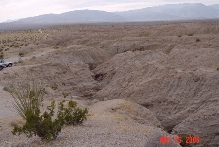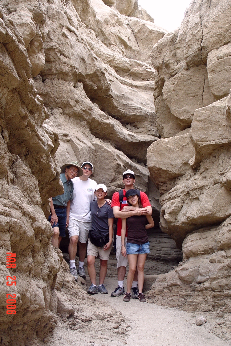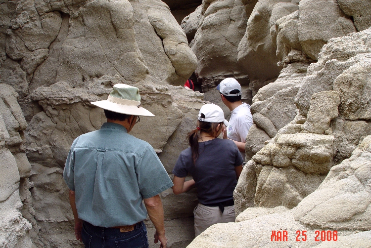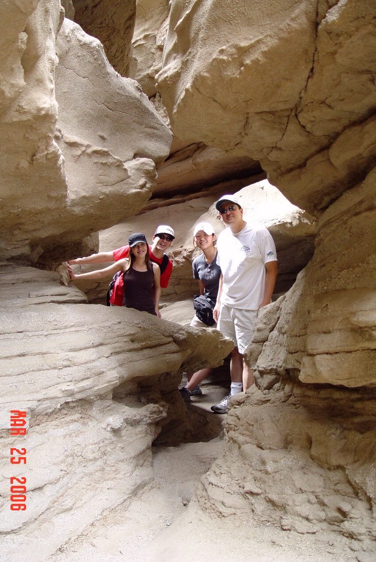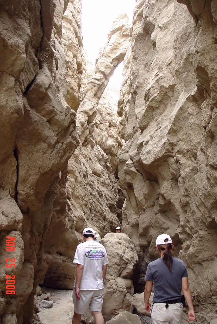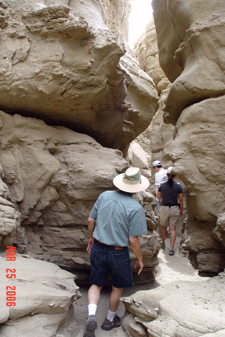 Anza-Borrego Desert State Park March 25 - 26, 2006 Forget the wildflowers, let's go explore The Slot ![]() The Slot is in this crevasse Location southeast of town, north of highway 78, see map ![]() Sets, Mike & Jackie, Dave & Roslynne .. Canyon best viewed at max foto size which improves depth perception ![]() Canyon formations created by powerful storm run-off CAUTION: Don't go there if it's stormy! ![]() Awesome sculptures! ![]() Admiring Nature's art work ![]() Watch that tittering column!!! ![]() The seditment was deposited by the Colorado River eons ago Please go to page 3 |